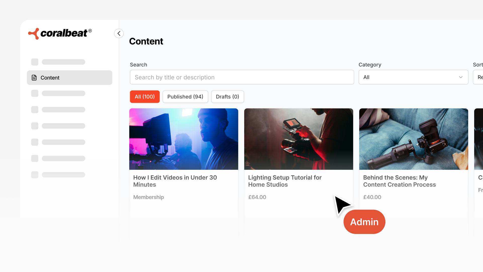 Videos stream directly to members with automatic adaptive quality. Upload once, and your videos play smoothly on any device. Course modules, tutorial series, behind-the-scenes content, recorded webinars all live here with clean, professional presentation.