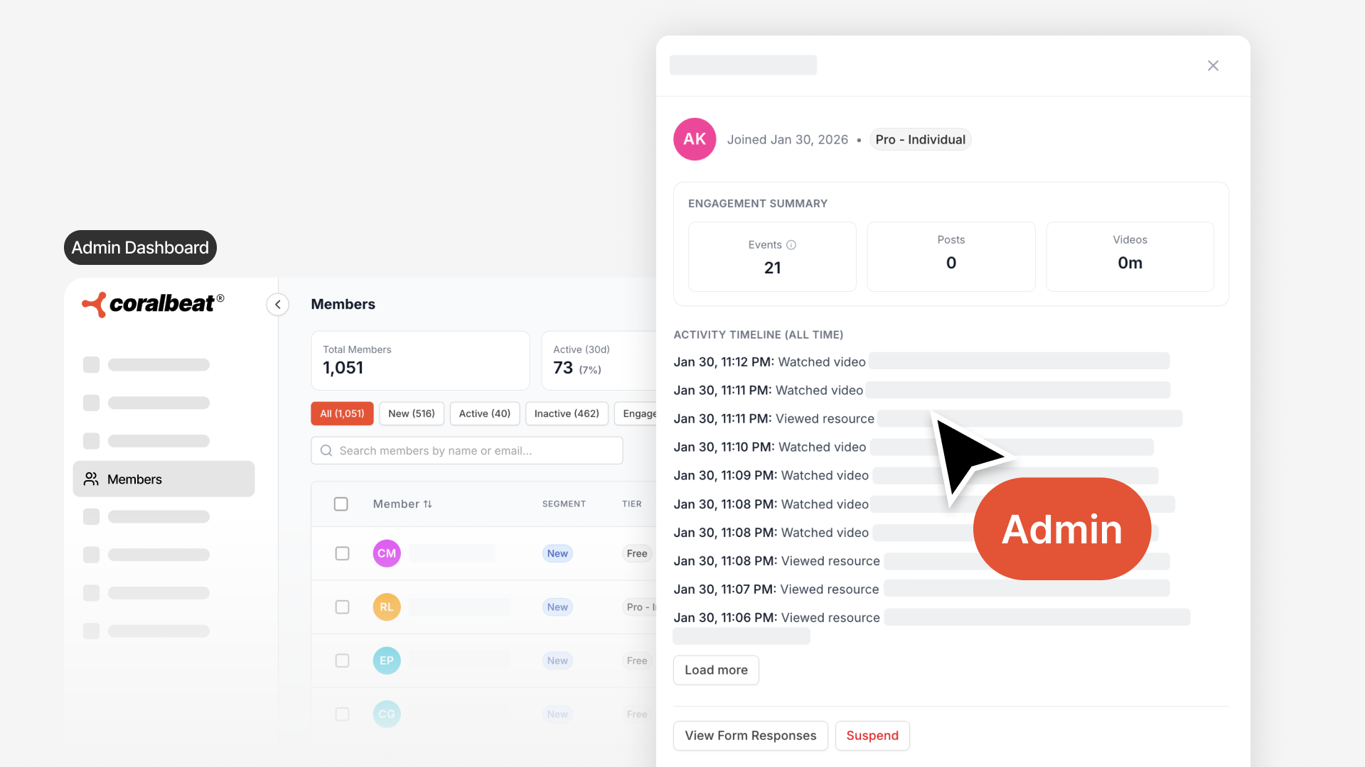 Access all member management from Community → Members in your Admin Dashboard. Search by name or email. Filter by segment, membership tier, or engagement level. View any member's signup responses and activity timeline. Suspend accounts if behavior violates guidelines. Everything happens in one place.